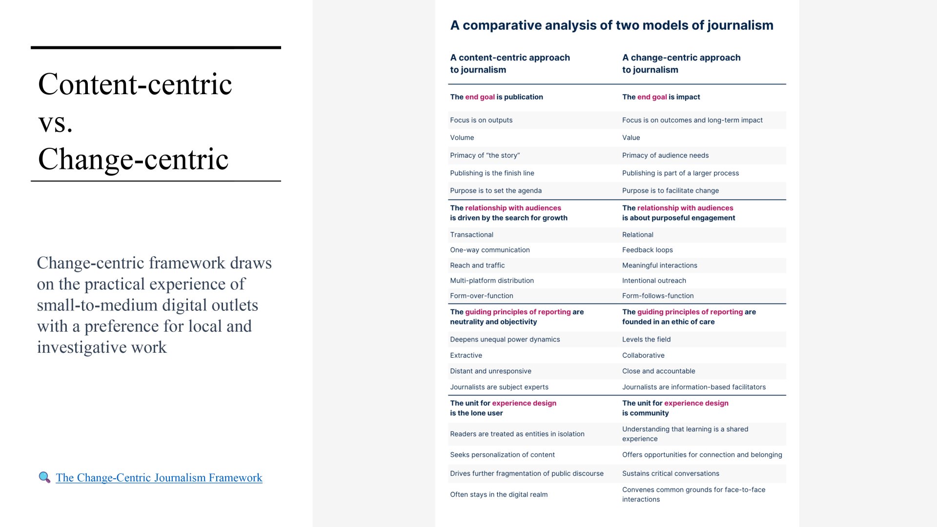 A slide appears on the screen depicting The Change-Centric Journalism Framework, comparing two models of publishing content. In a traditional, content-centric understanding of media the end goal is to publish a story and distribute it, the relationship with audiences is one-way communication. In a change-centric modality the end goal is to generate impact through purposeful engagement with audiences.